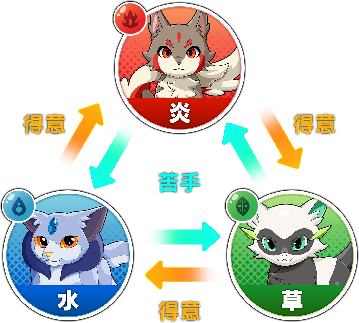 <属性> <好物> <相性> 炎 肉類 草に強く、水に弱い 水 魚介類 炎に強く、草に弱い 草 野菜類 水に強く、炎に弱い